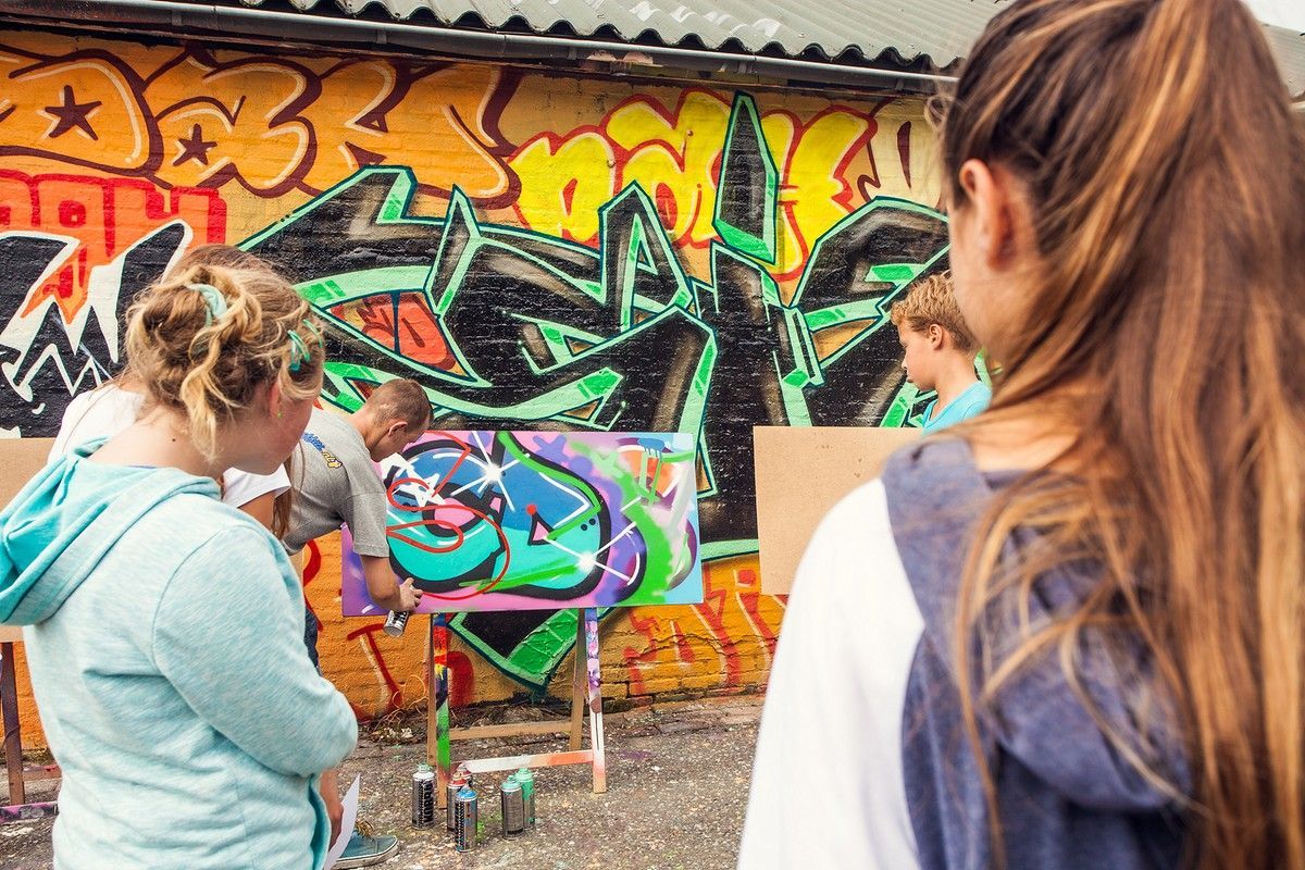 Allereerst krijgen jullie wat uitleg van onze begeleider(s) over de gereedschappen en technieken waar jullie vandaag mee gaat werken. Jullie leren hoe je veilig met de spuitbussen omgaat. Daarna worden in kleine groepen een aantal graffitioefeningen gedaan. Tijdens deze workshop bekladden we geen treinstellen, viaducten of saaie gevels, maar kleuren we gewoon het maagdelijk witte doek. Daarna gaan jullie samen met de groep een speciale ‘tag’ of ‘throw-up’ uitwerken op het doek. Wordt het een woord, een thema of een abstract?